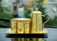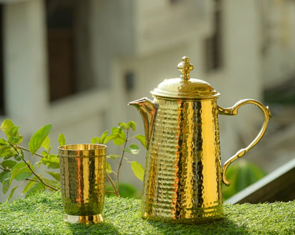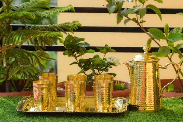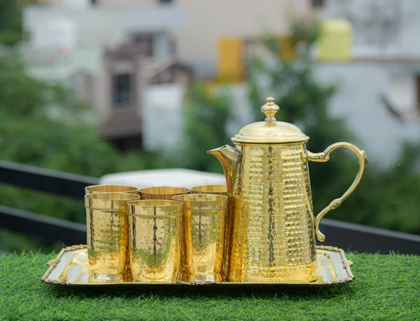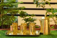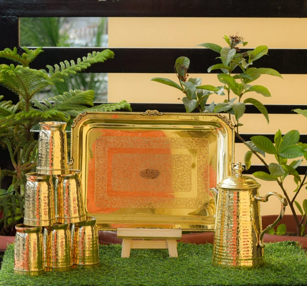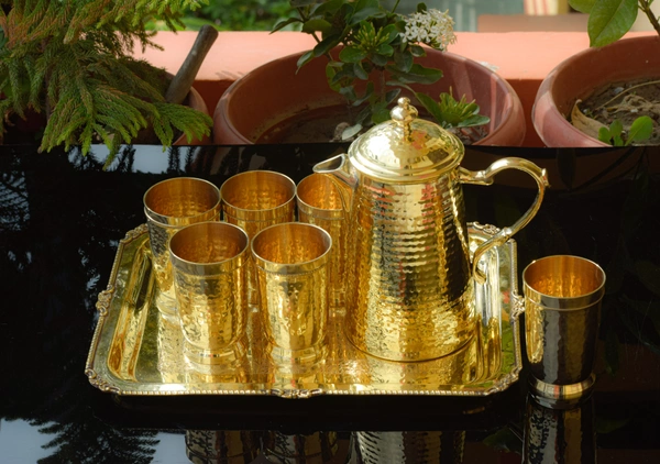 Brass hammered jug,glass,tray set
